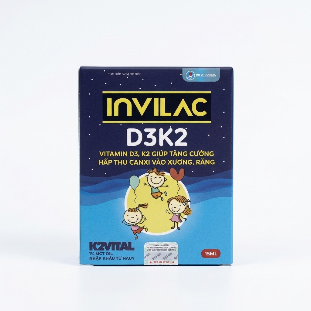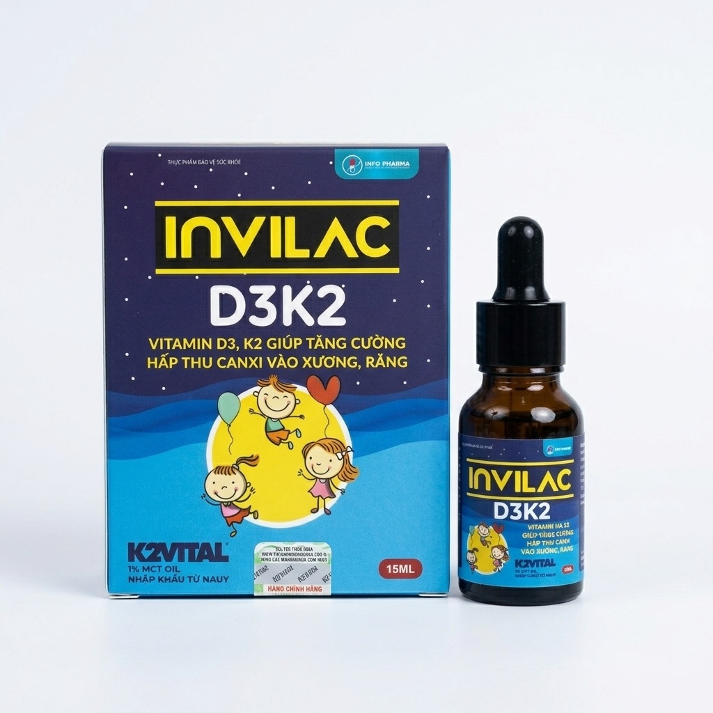 Thực phẩm bảo vệ sức khỏe INVILAC D3K2 chứa K2VITAL nhập khẩu Na Uy giúp tăng cường hấp thu canxi vào xương răng, giảm nguy cơ còi xương và loãng xương.