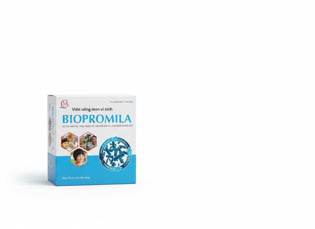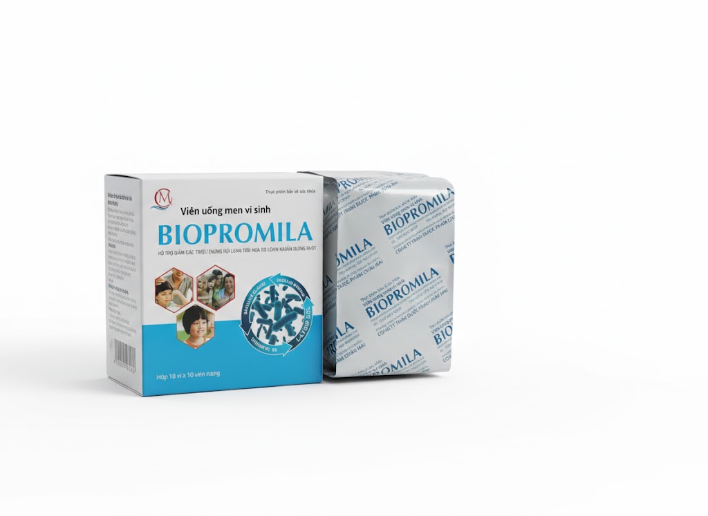 Tóm tắt chi tiết < 160 ký tự, chứa khóa chính, giọng văn y khoa. Mô tả: Viên uống men vi sinh BIOPROMILA giúp bổ sung vi khuẩn có lợi cho đường ruột, hỗ trợ giảm rối loạn tiêu hóa do loạn khuẩn như tiêu chảy, táo bón, đầy bụng, khó tiêu.