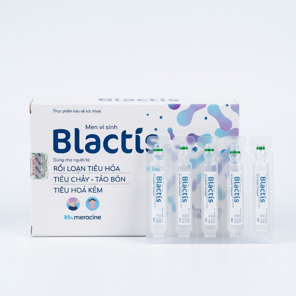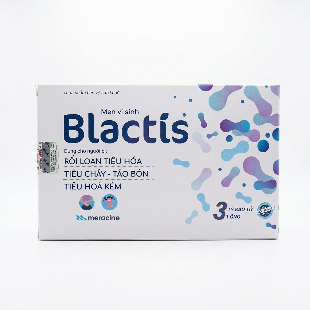 Thực phẩm bảo vệ sức khỏe Men vi sinh Blactis (Meracine) bổ sung 3 tỷ bào tử lợi khuẩn mỗi ống, giúp cải thiện tiêu hóa, giảm tiêu chảy và táo bón.
